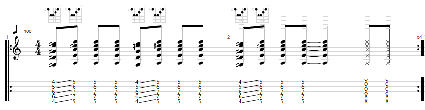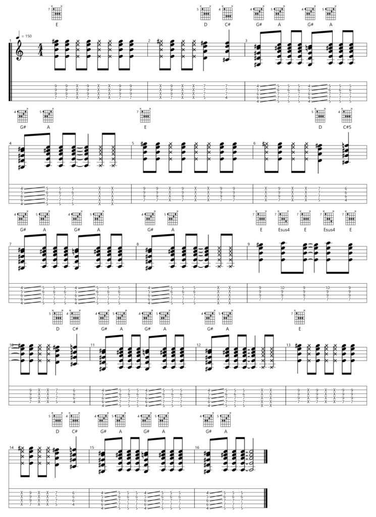 今回ブラッシングはバレーコードのフォームのままフレットから指を浮かす(それぞれの弦は触れたまま)事にて演奏します。(低音弦の)パワーコードのブラッシングと異なりハーモニクス音は鳴り難いですが、音を鳴らす・ブラッシングが頻繁に入れ変わりますのでにて、タイミングよくフレットを押さえていきましょう。デモ演奏の出だし2小節をコードEのみで練習すると良いかと思います。下記動画とTAB譜を参考にしてください。