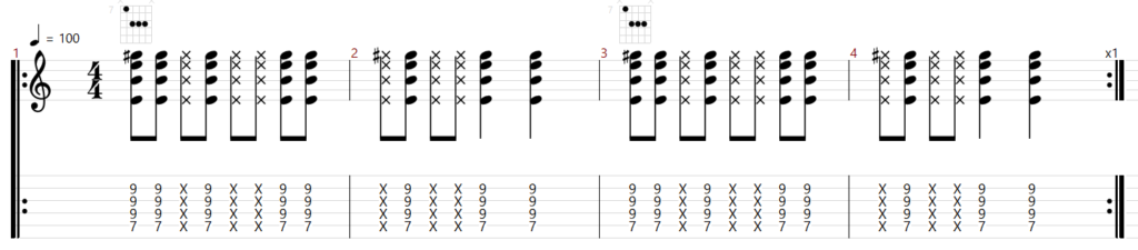 - 5弦ルートコードでのカッティング(ブラッシング)
