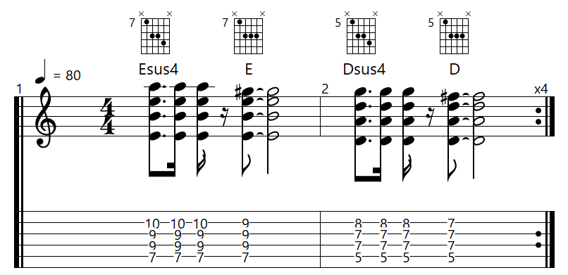 また、E→Esus4→D→Dsus4と演奏すると、こんな感じになります。
