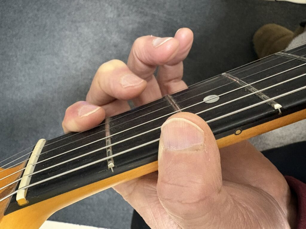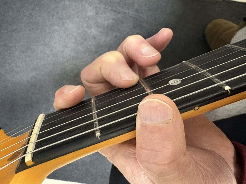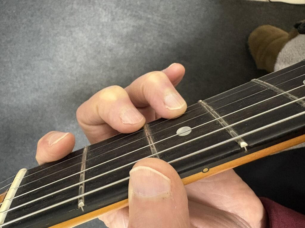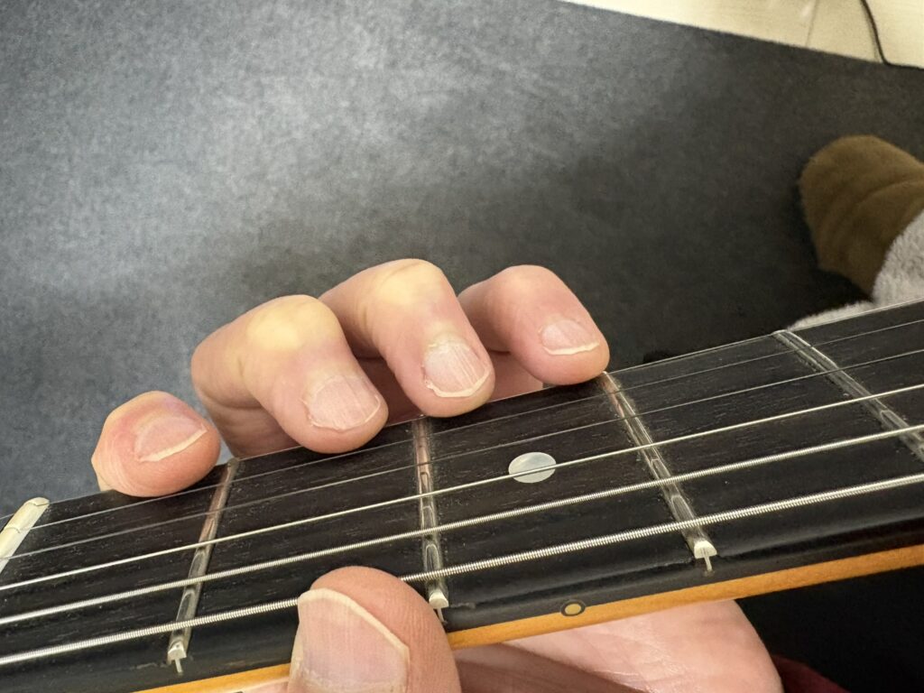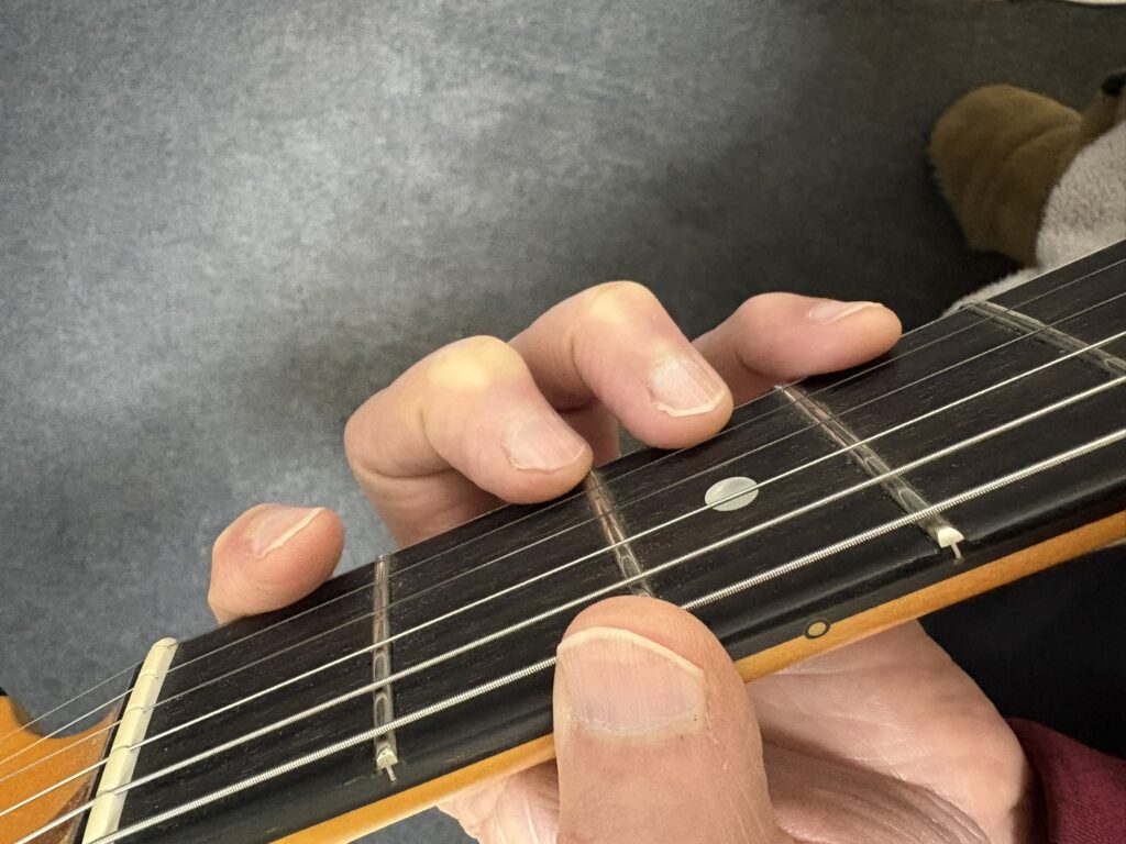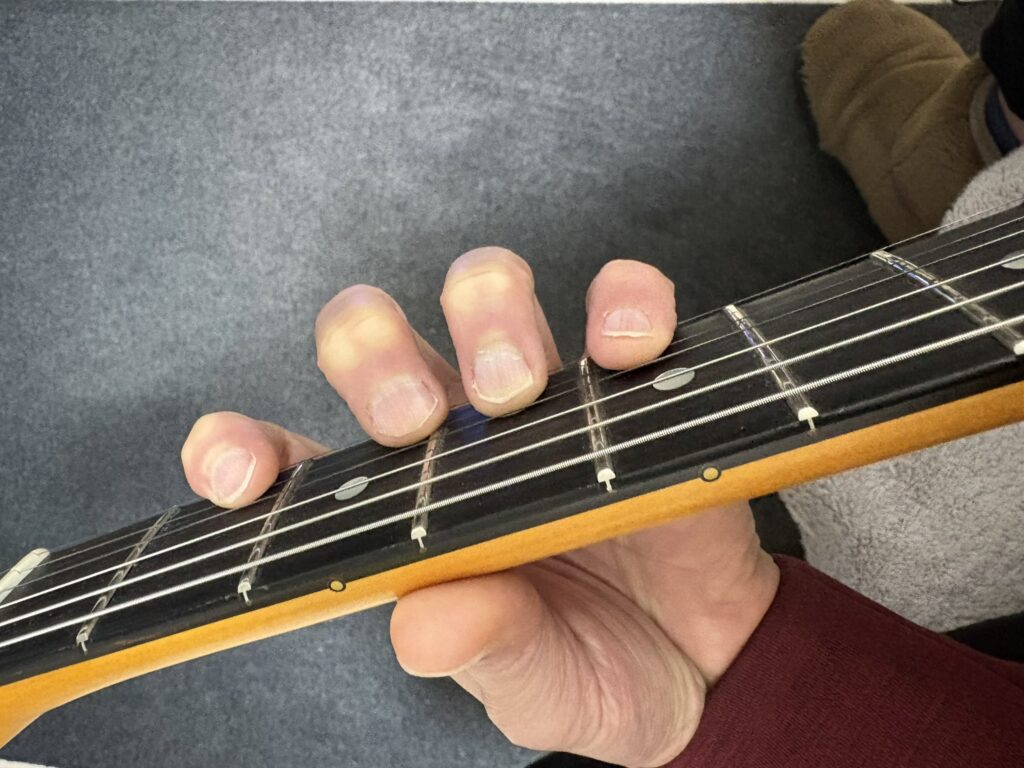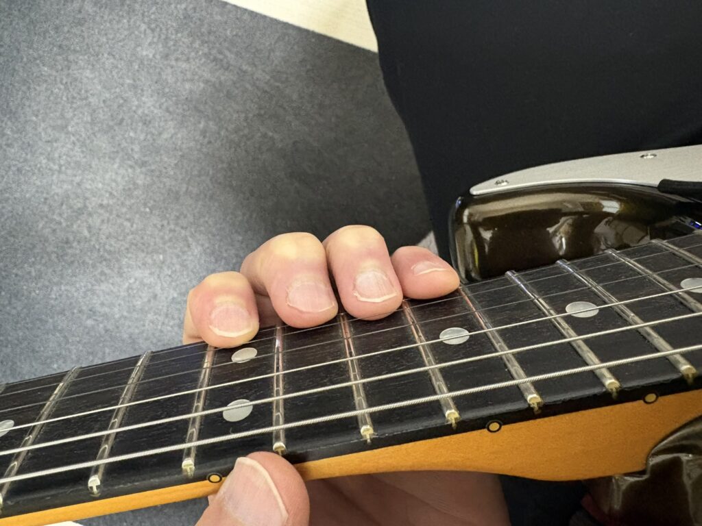 1フレットと12フレットでの運指の違い。それぞれの指を各フレットに対応させます。また、下位フレットにて下の写真のようにならないように注意です。