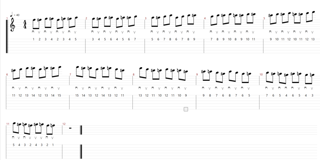 - 上記を繰り返し、12フレット(人差指)、13フレット(中指)、14フレット(薬指)、15フレット(小指)まで来たら逆の動作(15フレット(小指)、14フレット(薬指)、13フレット(中指)12フレット(人差指))で音をならします。